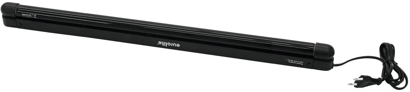 1 x Gerät, 1 x Leuchtmittel, 2 x Befestigungsmaterial, 2 x Schrauben, 1 x Bedienungsanleitung Stromversorgung: 230 V AC, 50 Hz Gesamtanschlusswert: 20 W Schutzart: IP20 Schutzklasse: SK II Stromanschluss: Festes Stromanschlusskabel mit Eurostecker Kabellänge: Ca. 1,6 m Lampenart: Leuchtstofflampe Farberzeugung: Ultraviolett (UV) Ansteuerung: Plug and play Abstrahlwinkel: 270° Abstrahlwinkel (1/2 Peak): 270° Bauform: Röhre T8 Brennstellung: S180 (Universal) Wellenlänge: Ultraviolett (UV) 365 nm Gehäusefarbe: Schwarz Material: Aluminium Maße: Länge: 63,5 cm Breite: 3,5 cm Höhe: 6 cm Gewicht: 420 g Photobiologische Sicherheit: Risiko Gruppe 0